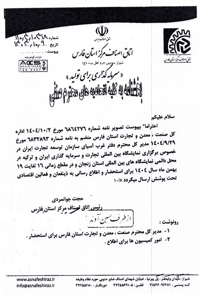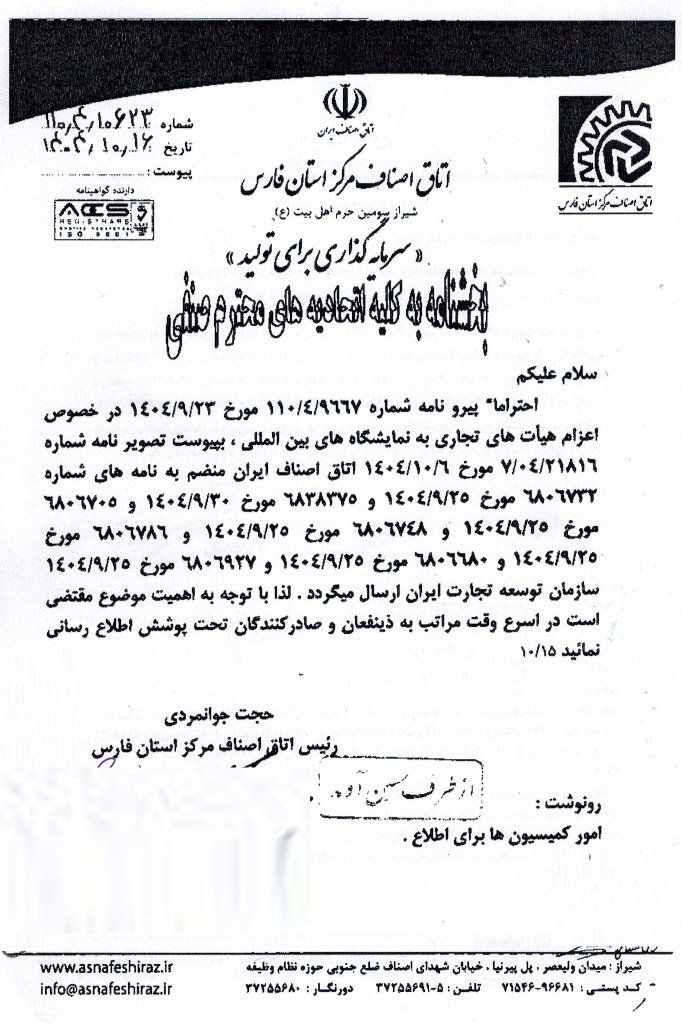 اخبار برگزاری نمایشگاه های داخلی و خارجی و برپائی پاویون های جمهوری اسلامی ارسالی اتاق اصناف در هفته گذشته