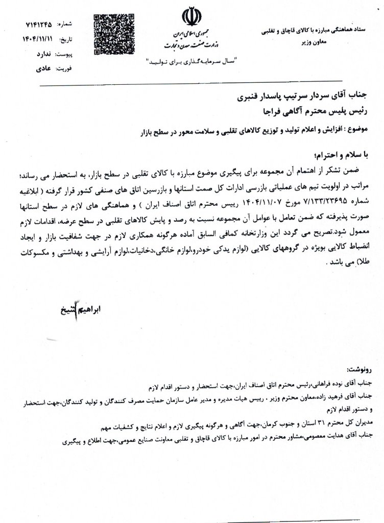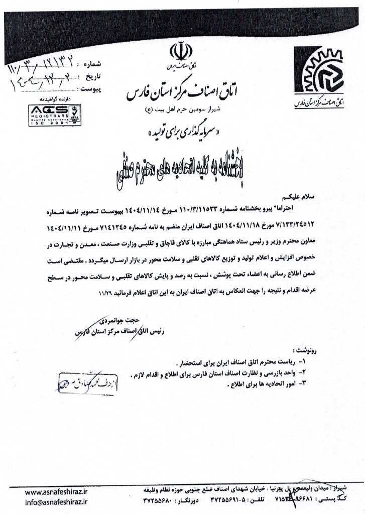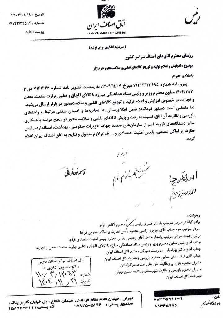 بخشنامه اتاق اصناف در خصوص اعلام افزایش تولید و توزیع اقلام تقلبی در حوزه محصولات سلامت محور در سطح بازار