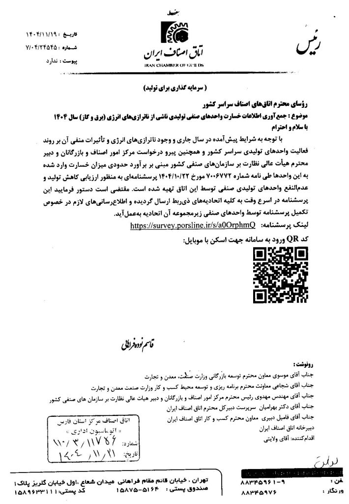 بخشنامه اتاق اصناف در خصوص جمع آوری اطلاعات خسارات واحدهای صنفی تولیدی ناشی از ناترازی انرژی