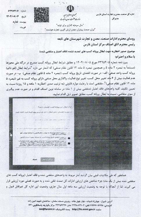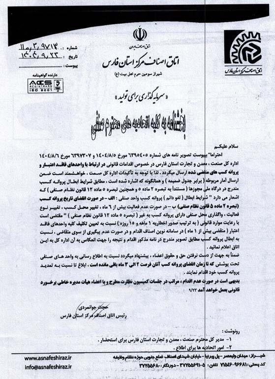 بخشنامه اتاق اصناف در خصوص مهلت یک ماهه تمدید پروانه کسب و فراخوان اعضائی که کمتر از ۳ ماه از انقضای پروانه کسب آنها مانده است ، جهت تمدید پروانه کسب