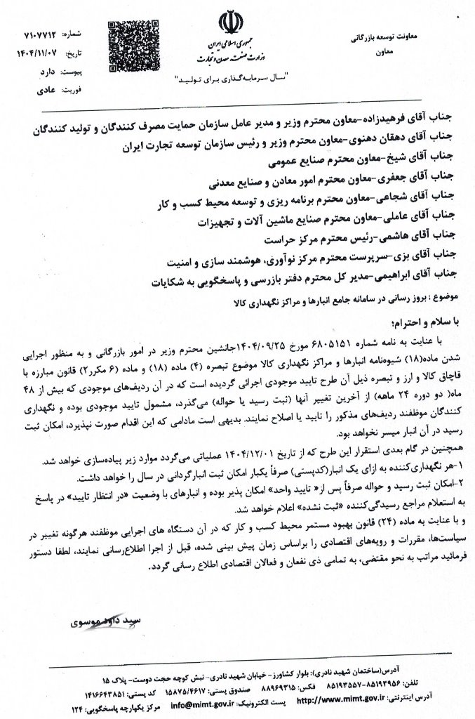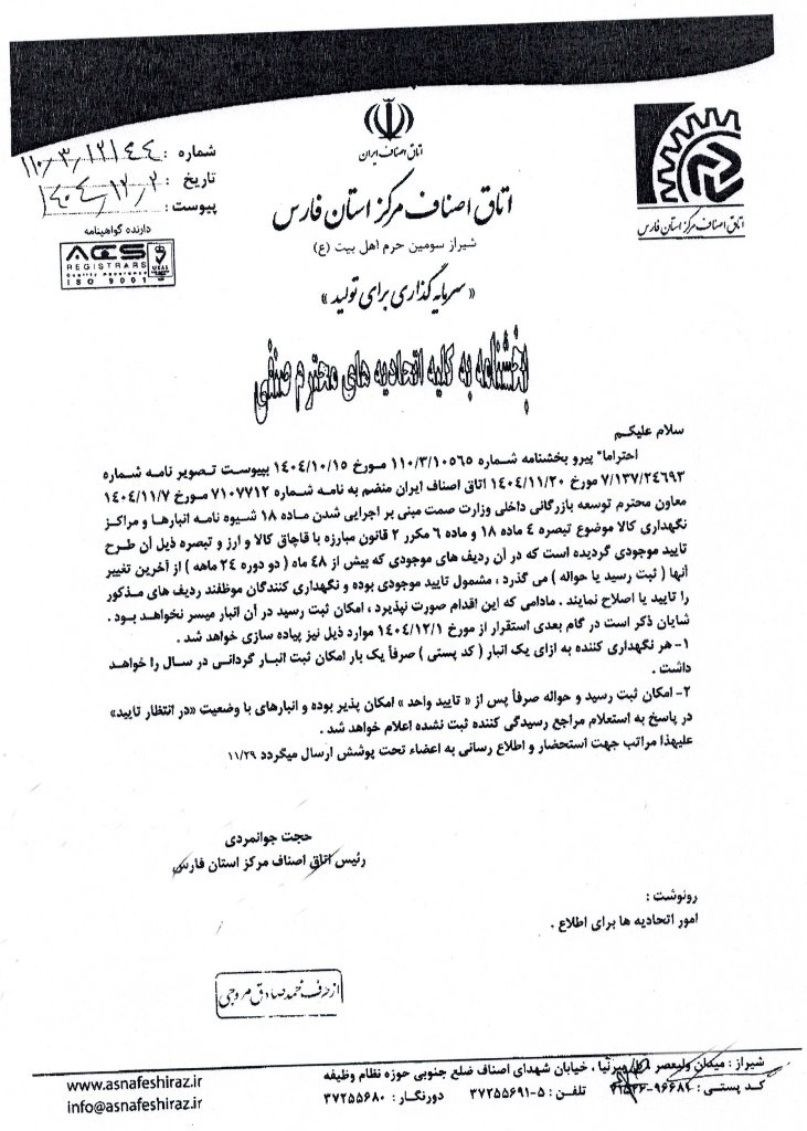 بخشنامه اتاق اصناف مبنی بر اجرائی شدن ماده ۱۸ شیوه نامه انبارها و مراکز نگهداری کالا