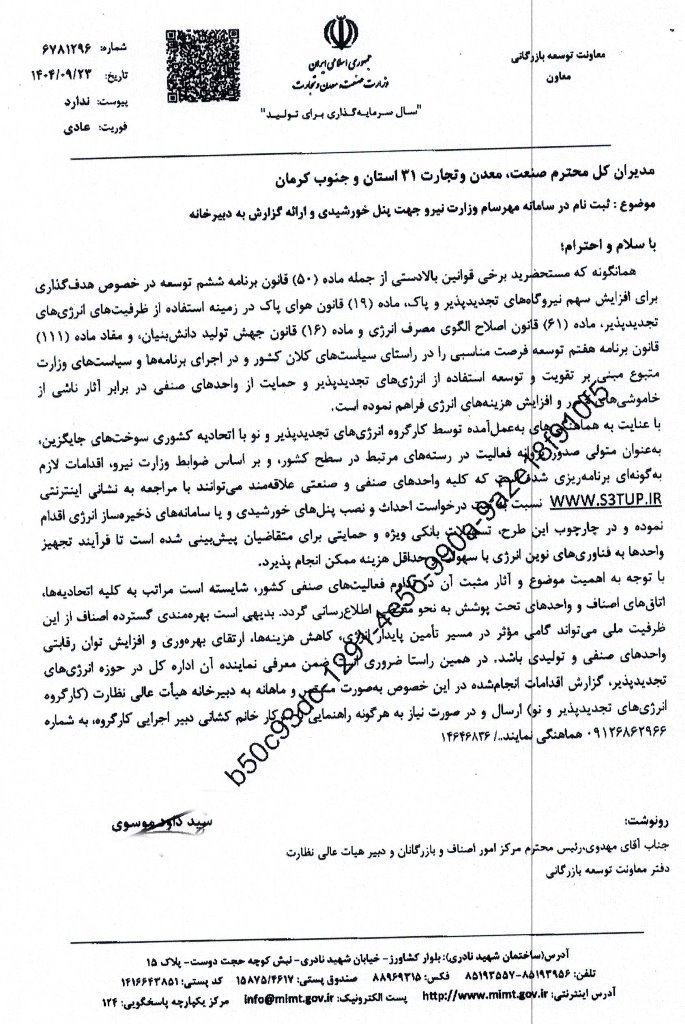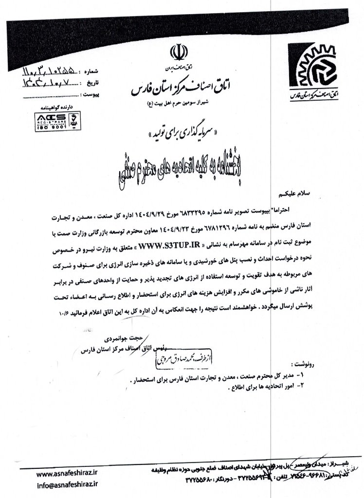 بخشنامه اتاق اصناف مبنی بر معرفی سامانه مهرسام متعلق به وزارت نیرو در خصوص درخواست احداث و نصب پنل های خورشیدی